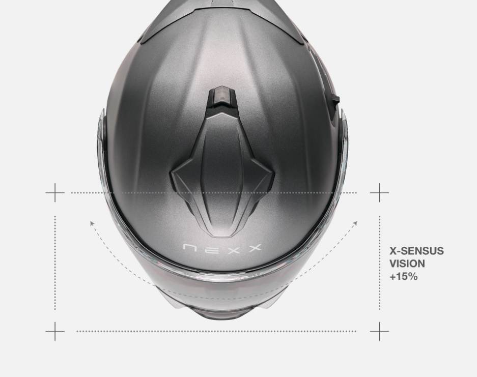 - X-Sensus Vision – визьорът предлага 15% по-широко зрително поле, осигурявайки по-добра периферна видимост за по-голяма безопасност на пътя. В допълнение, вградените слънчеви очила с UV защита предпазват очите от вредните лъчи и подобряват комфорта при дълги пътувания.