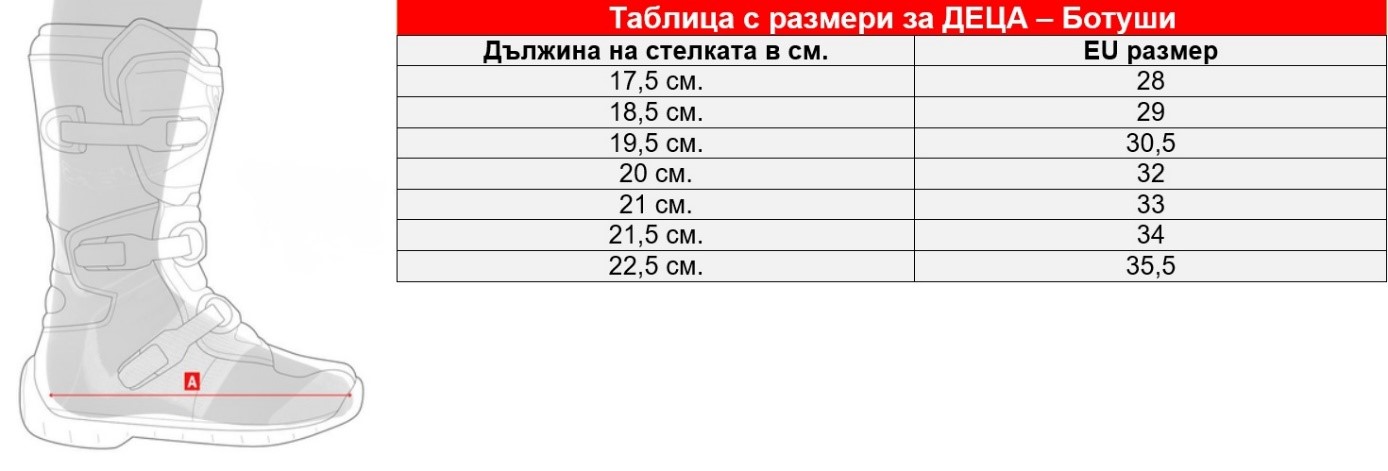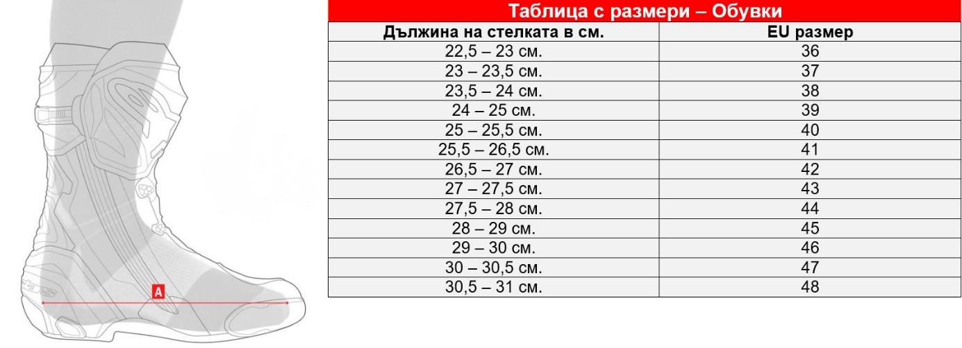 Правилният размер на мото обувките е от съществено значение за вашата стабилност и защита по време на каране. Обувките трябва да прилягат плътно, но без да създават дискомфорт, като осигуряват добро сцепление и подкрепа на глезена. Препоръчваме да измерите дължината на стъпалото си и да сравните резултата с предоставената таблица с размери. Имайте предвид, че при по-дълги карания или при носене на дебели чорапи може да се наложи избор на малко по-голям размер за допълнителен комфорт.