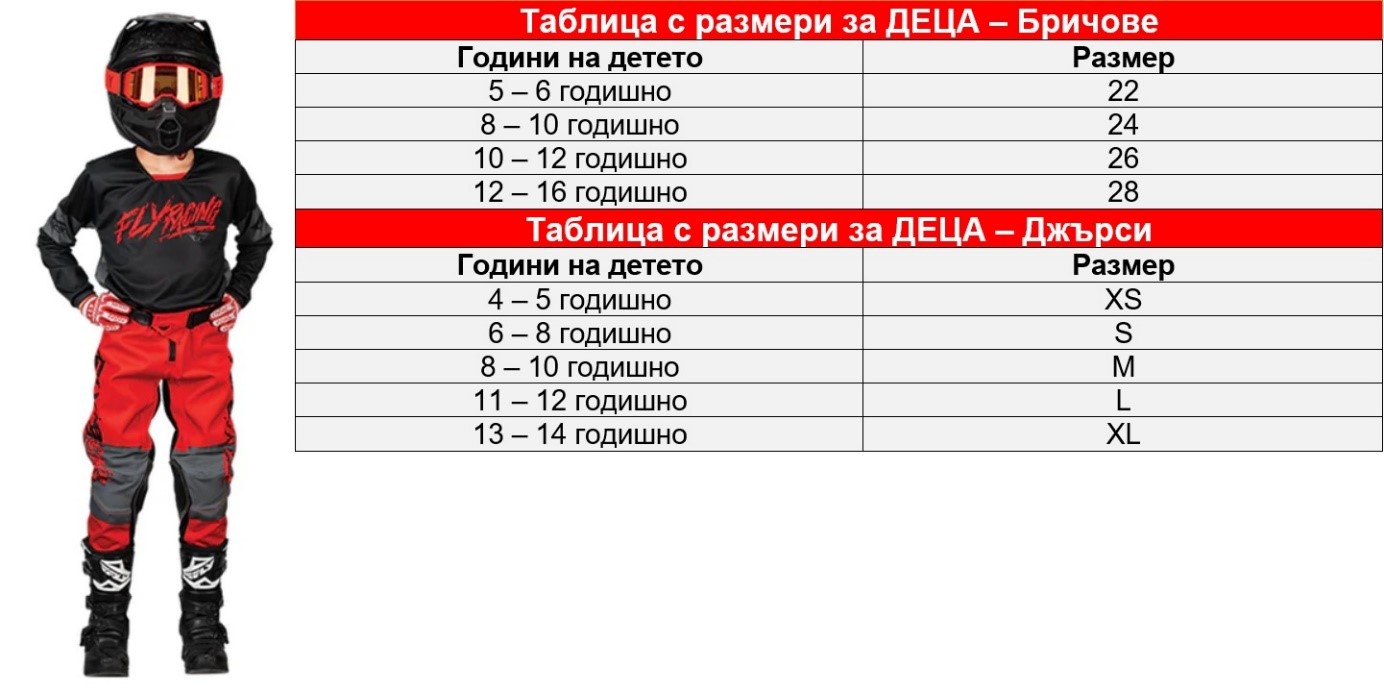 Когато избирате екипировка за деца, е важно да осигурите точен размер, за да гарантирате безопасност и удобство. Екипировката не трябва да бъде прекалено стегната или твърде широка. Ето таблиците за размерите на каските и екипировката за деца: