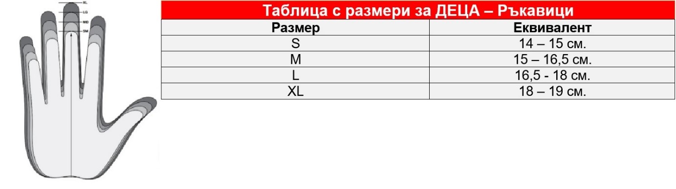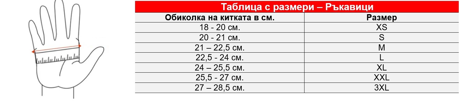 Размерът на ръкавиците трябва да осигурява добър захват и комфорт при управление. За да определите размера на ръкавиците, измерете обиколката на дланта си без палеца.