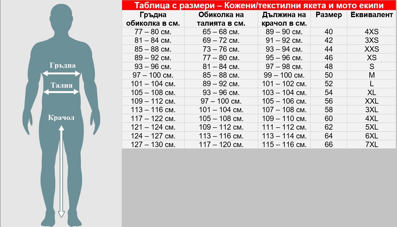 - Гръден кош – За мото якетата измерете гръдния кош в най-широката му част, като държите ръцете леко раздалечени.
